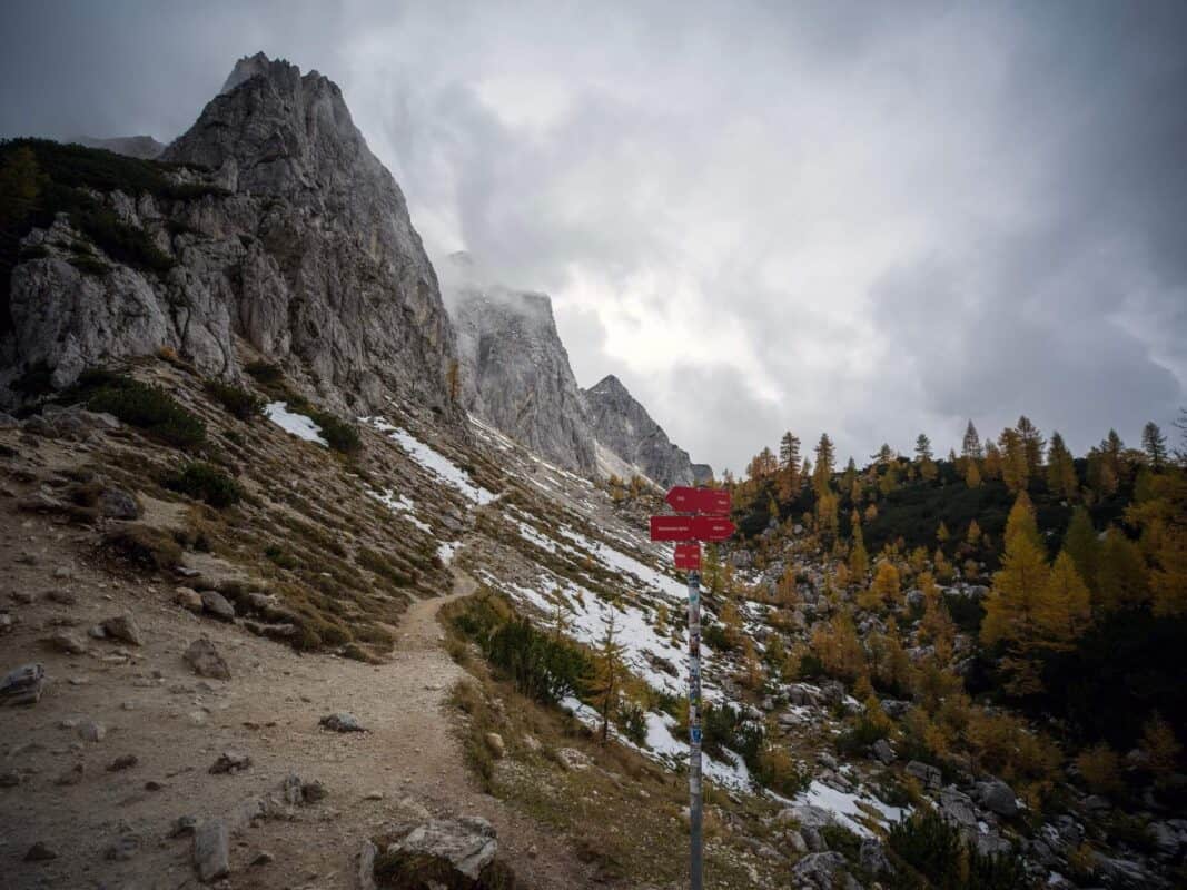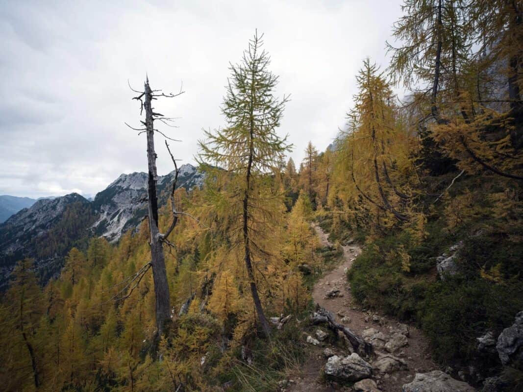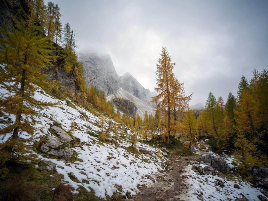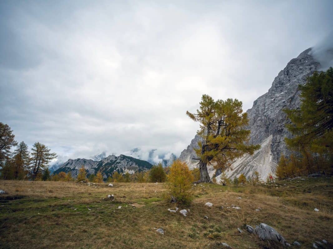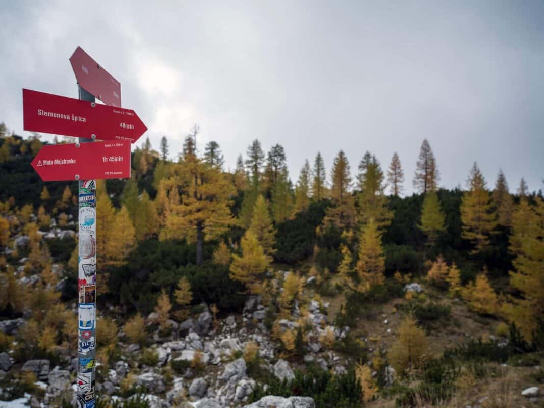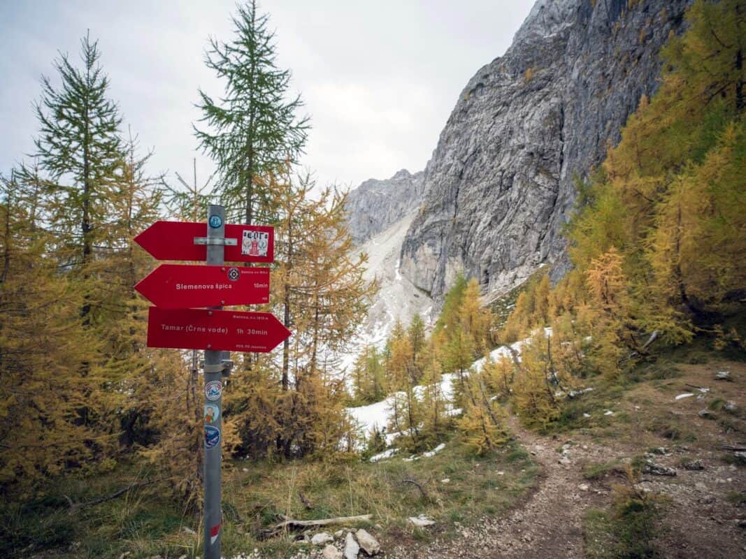In der Nähe des Gipfels von Slemenova Špica liegt eine kleine Mulde, in der sich im Sommer Wasser sammelt. Im Herbst schaffen die Spiegelung der goldenen Lärchen und die graue Silhouette des Jalovec im Hintergrund eines der kultigsten Bilder der slowenischen Berge. Dieser Anblick hat unzählige Postkarten und Kalender geschmückt. Es ist kein Wunder, dass so viele immer wieder hierher zurückkehren – jede Saison auf Sleme zeigt ein anderes Gesicht, doch der Herbst bleibt die Königin unter ihnen.