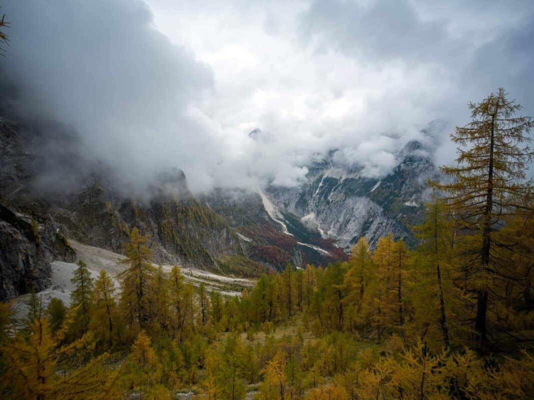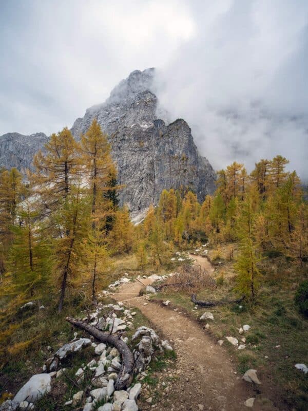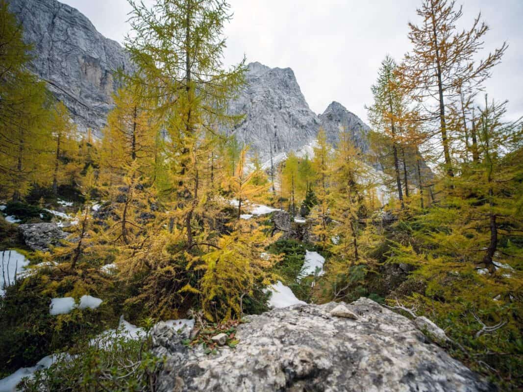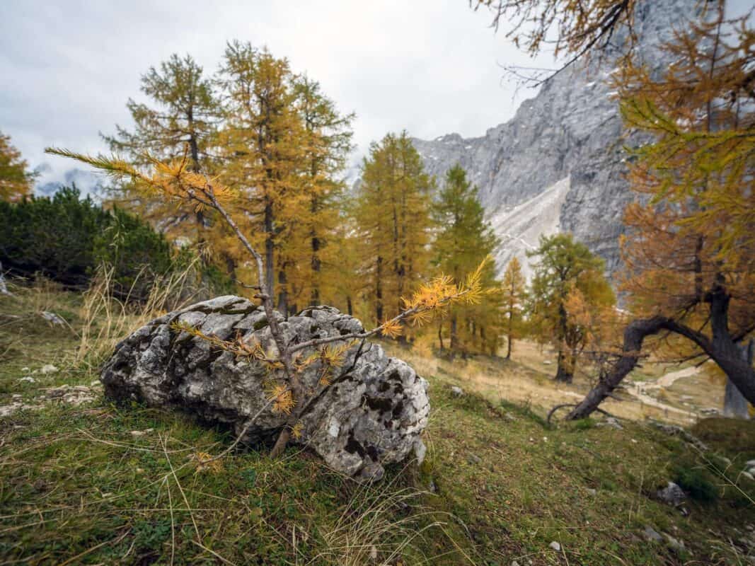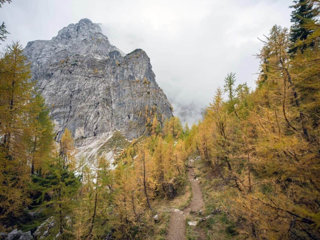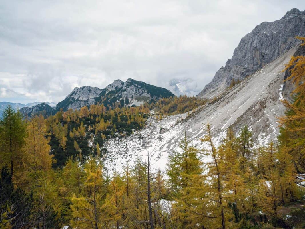 In der Nähe des Gipfels von Slemenova Špica liegt eine kleine Mulde, in der sich im Sommer Wasser sammelt. Im Herbst schaffen die Spiegelung der goldenen Lärchen und die graue Silhouette des Jalovec im Hintergrund eines der kultigsten Bilder der slowenischen Berge. Dieser Anblick hat unzählige Postkarten und Kalender geschmückt. Es ist kein Wunder, dass so viele immer wieder hierher zurückkehren – jede Saison auf Sleme zeigt ein anderes Gesicht, doch der Herbst bleibt die Königin unter ihnen.