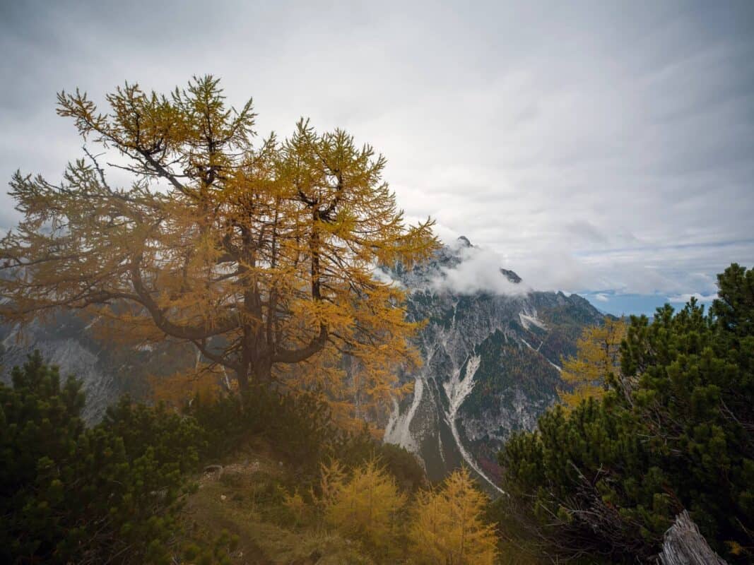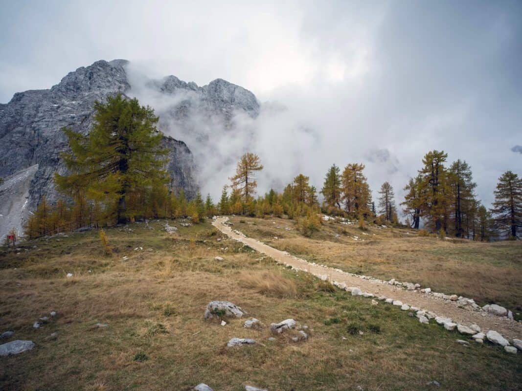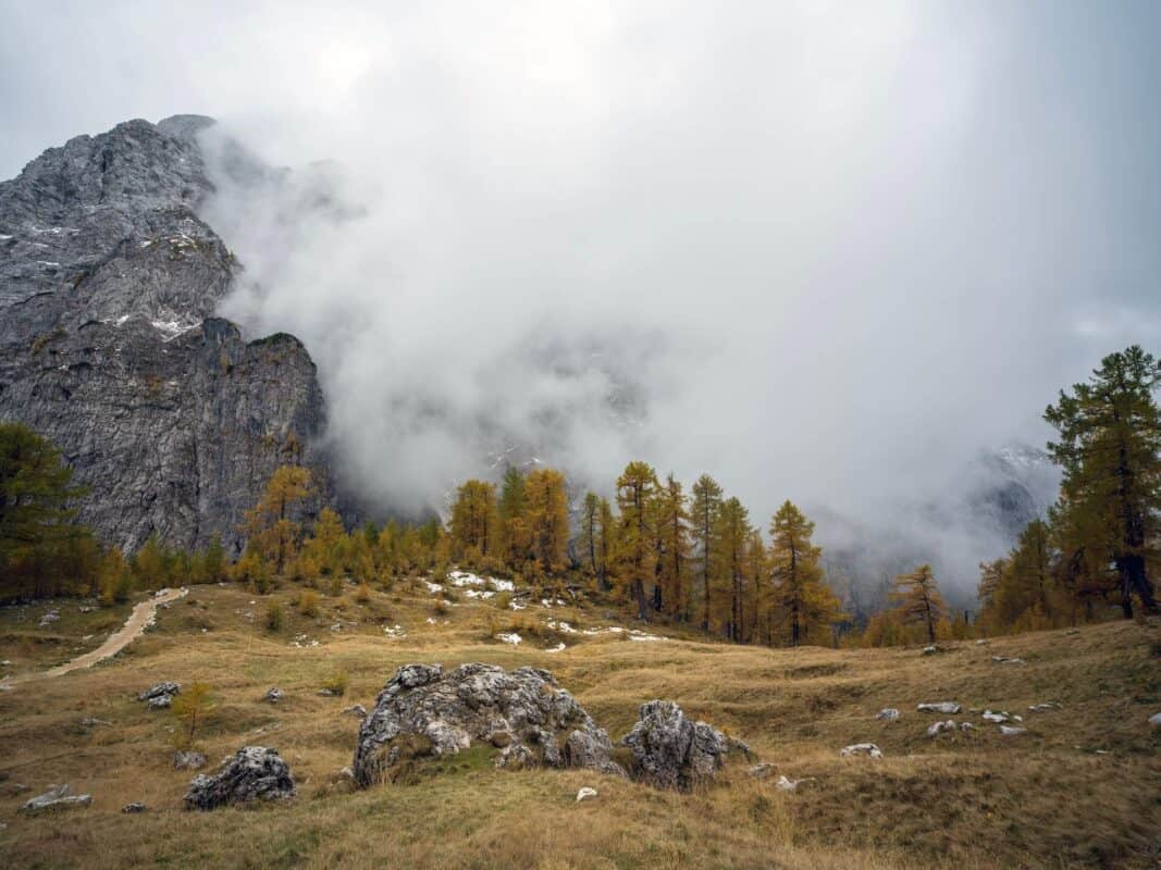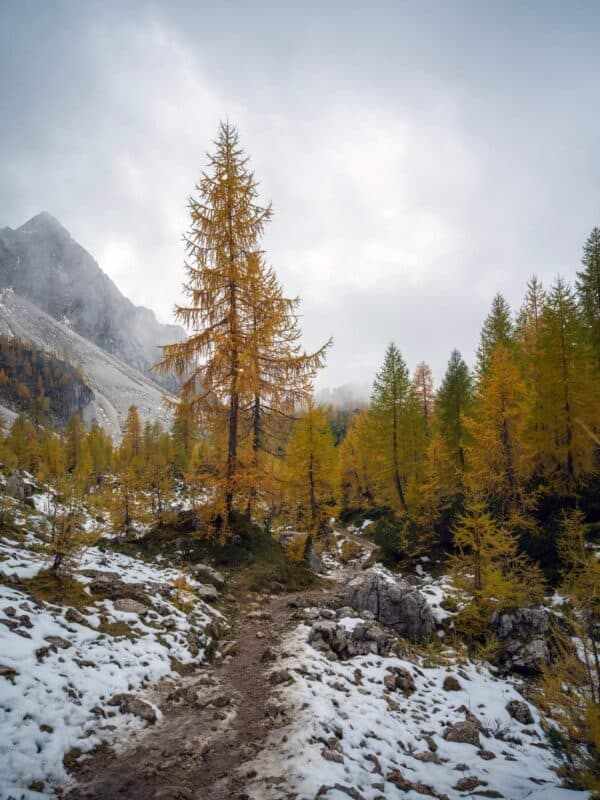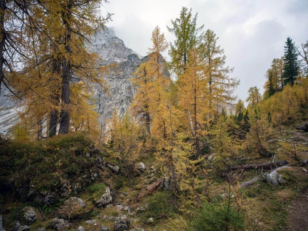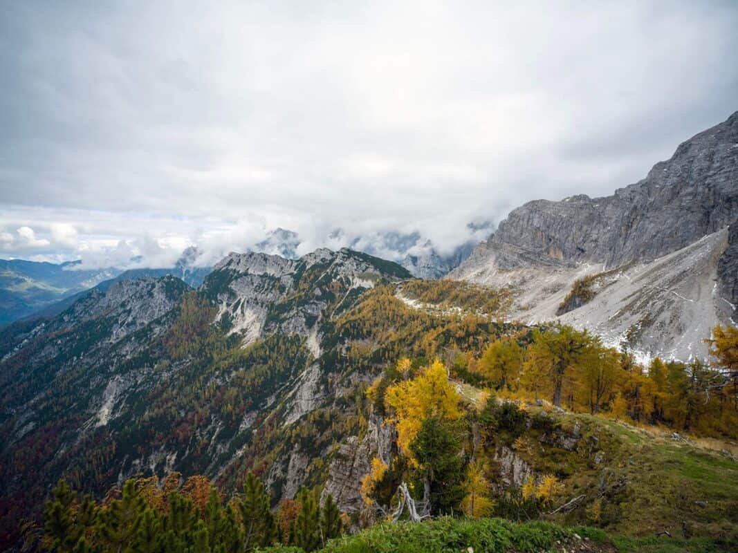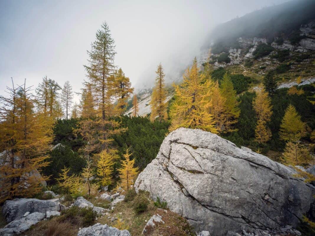 In der Nähe des Gipfels von Slemenova Špica liegt eine kleine Mulde, in der sich im Sommer Wasser sammelt. Im Herbst schaffen die Spiegelung der goldenen Lärchen und die graue Silhouette des Jalovec im Hintergrund eines der kultigsten Bilder der slowenischen Berge. Dieser Anblick hat unzählige Postkarten und Kalender geschmückt. Es ist kein Wunder, dass so viele immer wieder hierher zurückkehren – jede Saison auf Sleme zeigt ein anderes Gesicht, doch der Herbst bleibt die Königin unter ihnen.