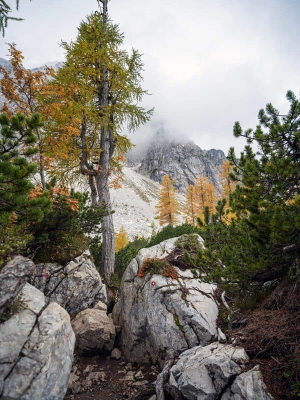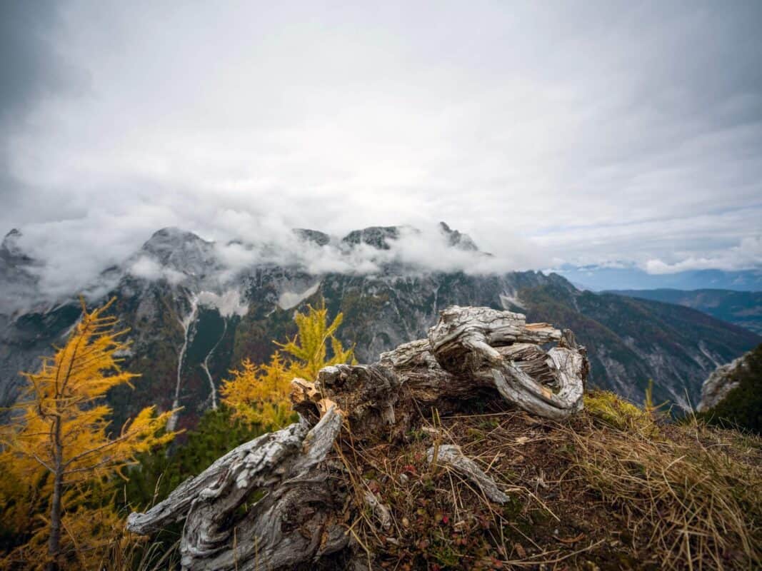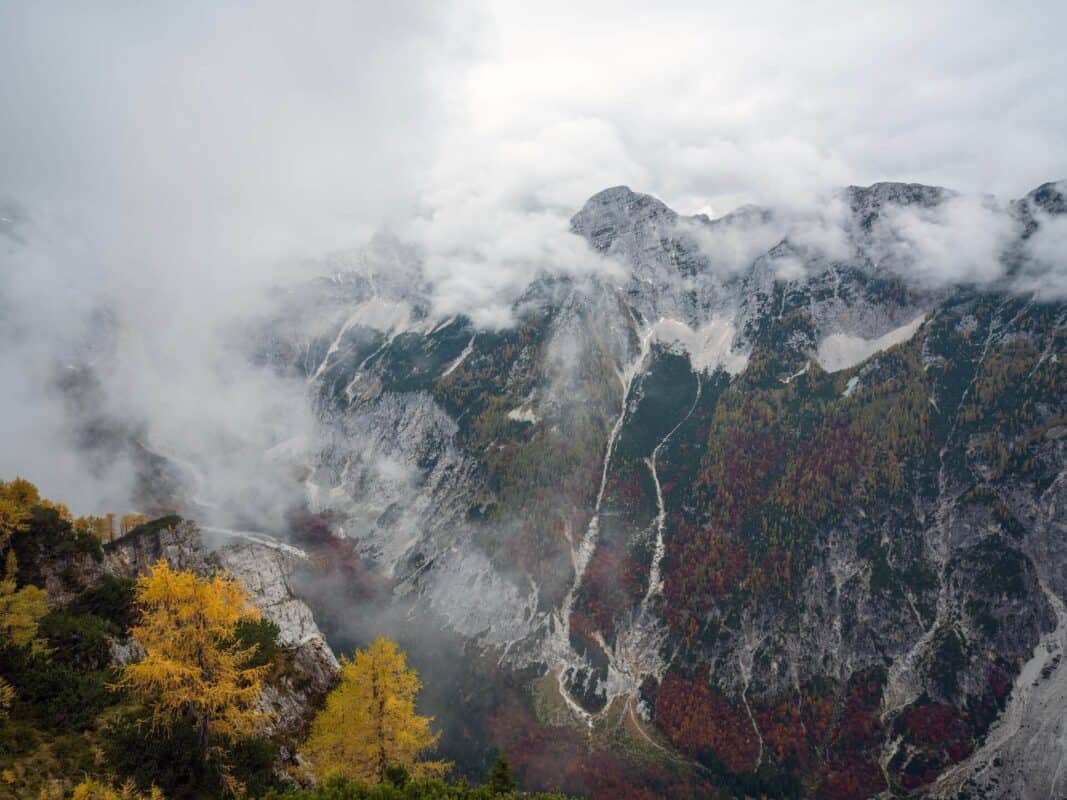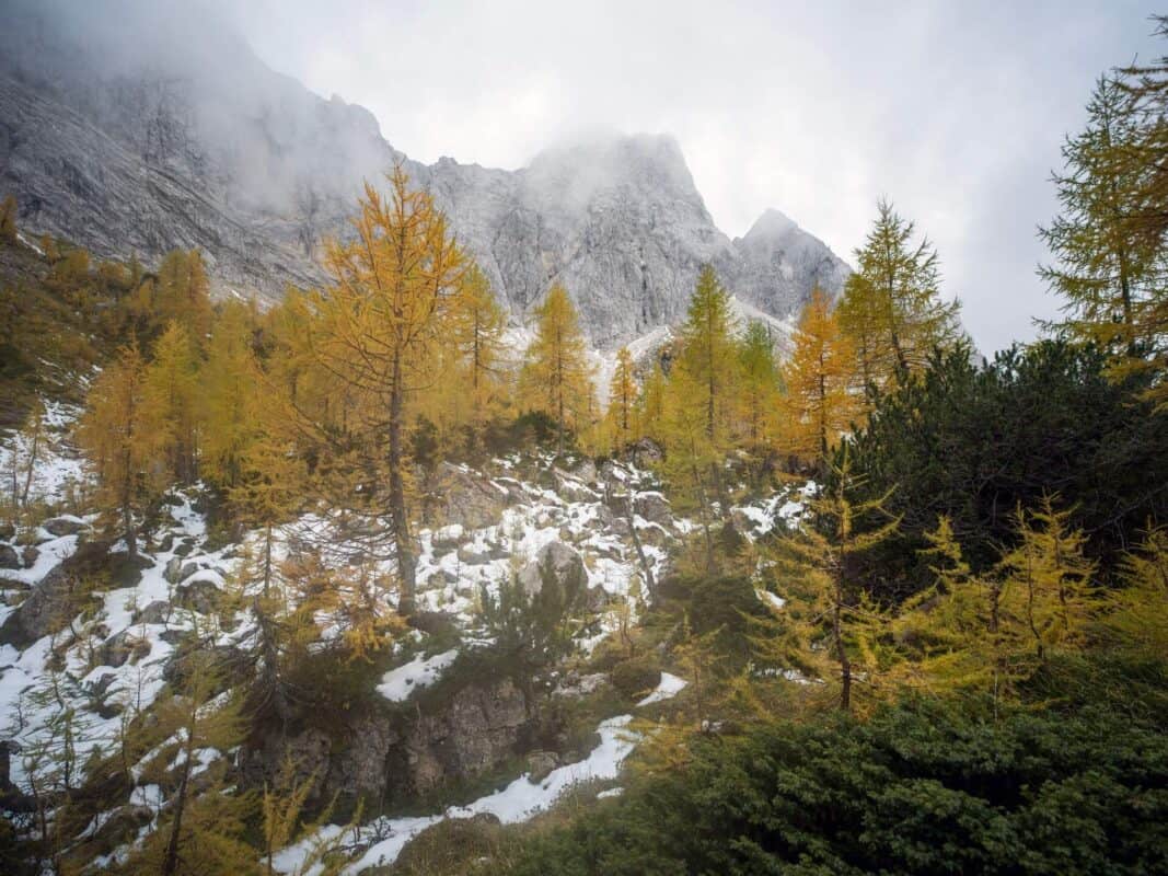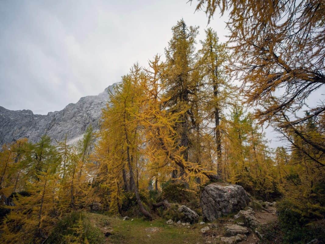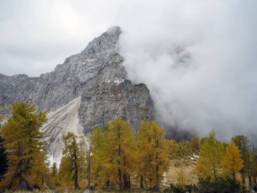 In der Nähe des Gipfels von Slemenova Špica liegt eine kleine Mulde, in der sich im Sommer Wasser sammelt. Im Herbst schaffen die Spiegelung der goldenen Lärchen und die graue Silhouette des Jalovec im Hintergrund eines der kultigsten Bilder der slowenischen Berge. Dieser Anblick hat unzählige Postkarten und Kalender geschmückt. Es ist kein Wunder, dass so viele immer wieder hierher zurückkehren – jede Saison auf Sleme zeigt ein anderes Gesicht, doch der Herbst bleibt die Königin unter ihnen.
