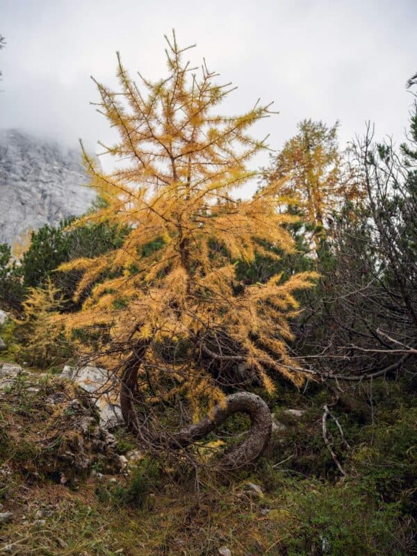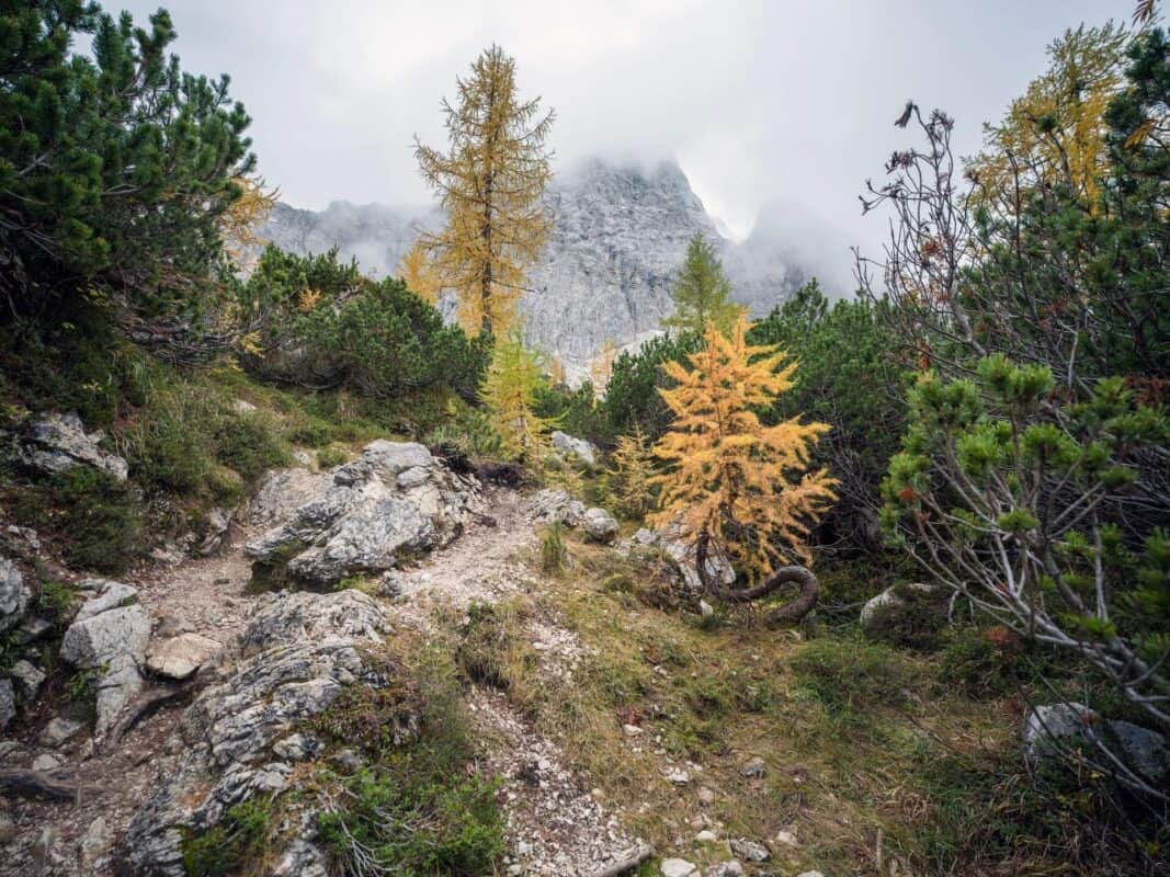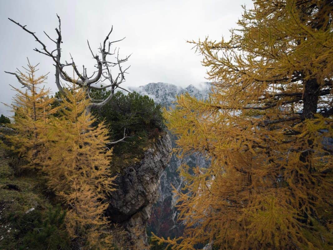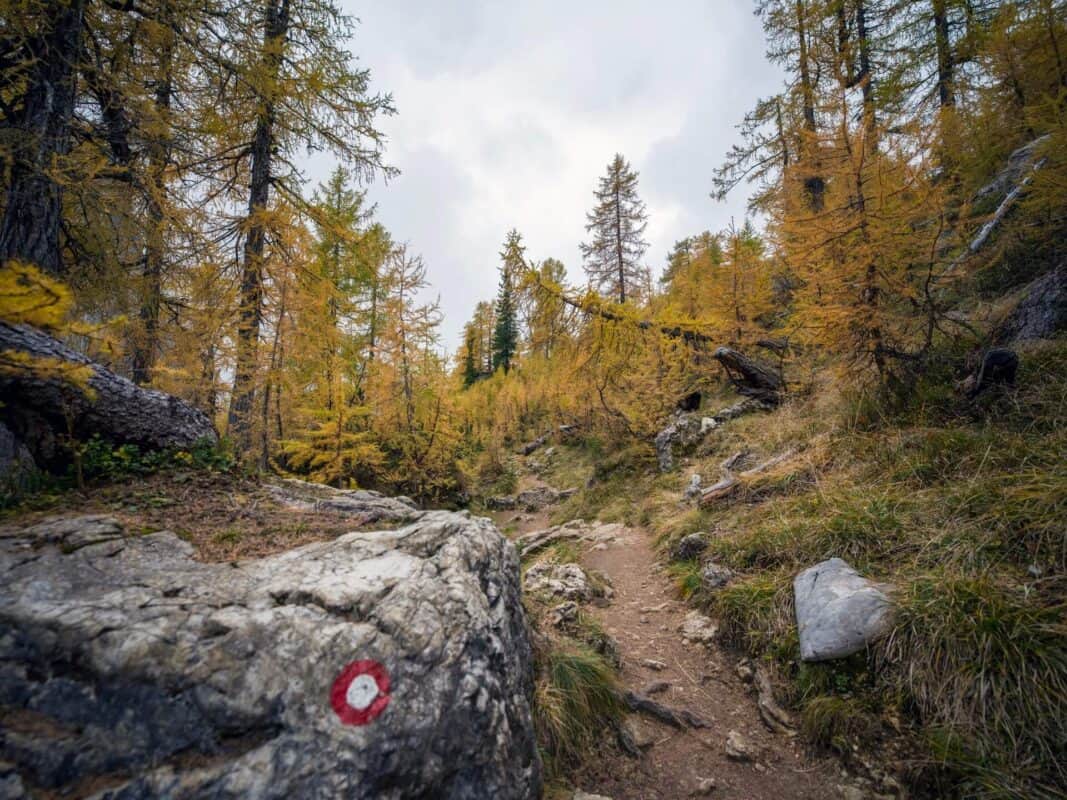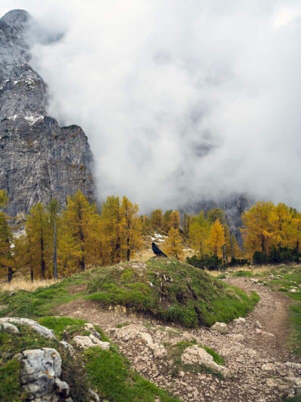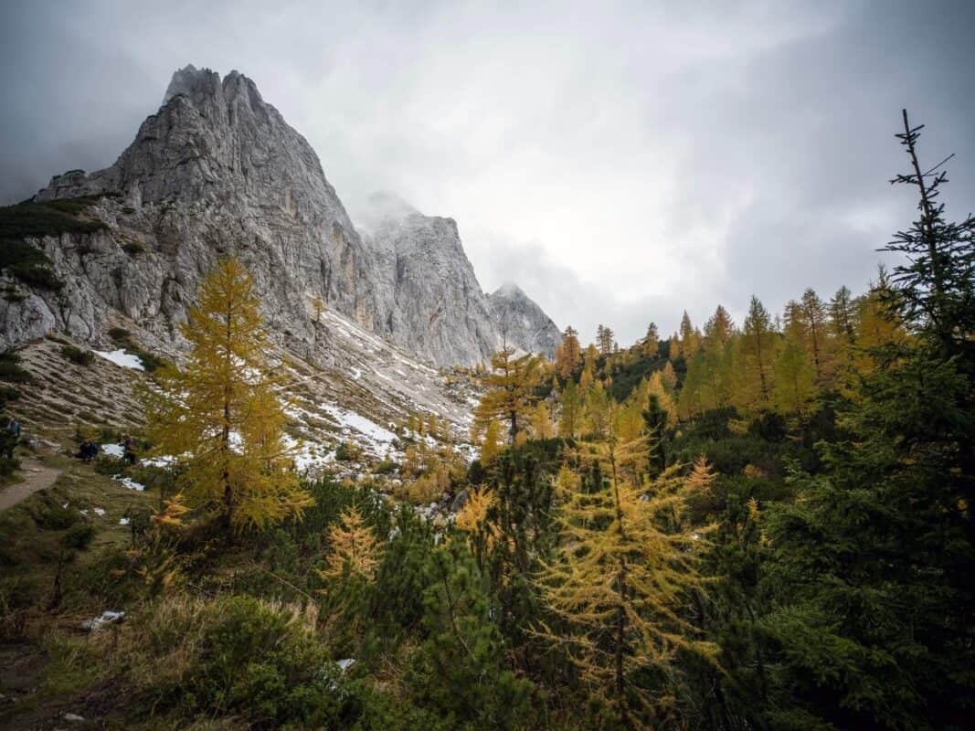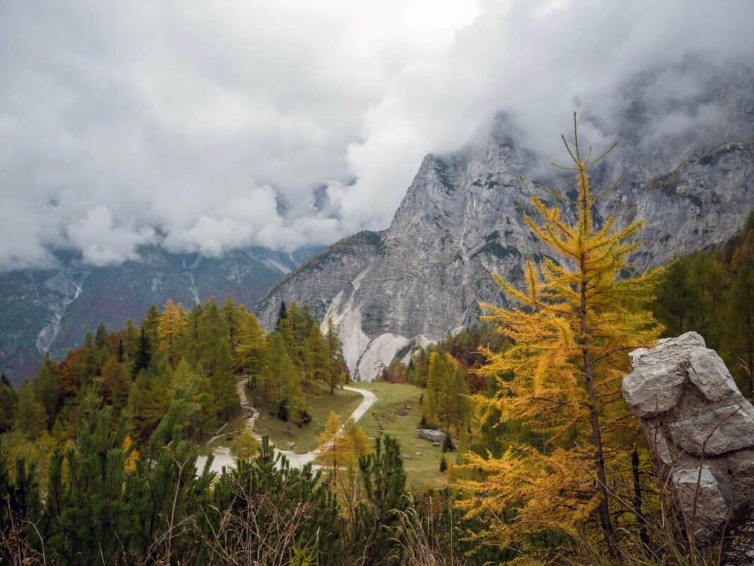 In der Nähe des Gipfels von Slemenova Špica liegt eine kleine Mulde, in der sich im Sommer Wasser sammelt. Im Herbst schaffen die Spiegelung der goldenen Lärchen und die graue Silhouette des Jalovec im Hintergrund eines der kultigsten Bilder der slowenischen Berge. Dieser Anblick hat unzählige Postkarten und Kalender geschmückt. Es ist kein Wunder, dass so viele immer wieder hierher zurückkehren – jede Saison auf Sleme zeigt ein anderes Gesicht, doch der Herbst bleibt die Königin unter ihnen.