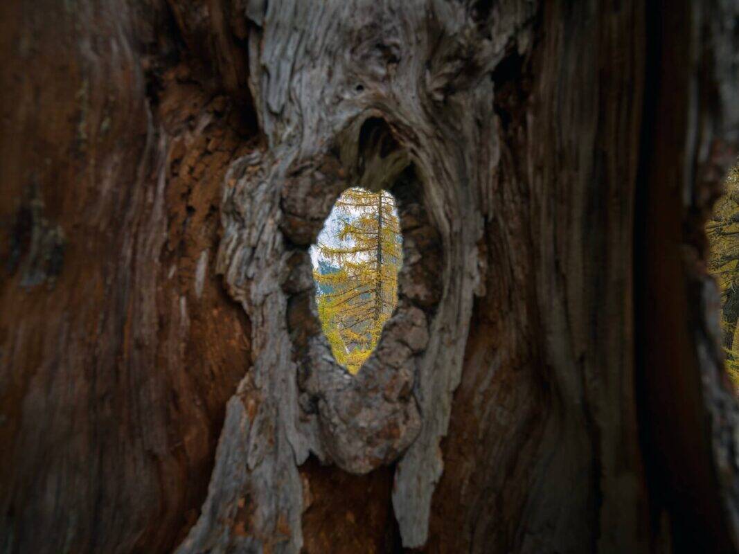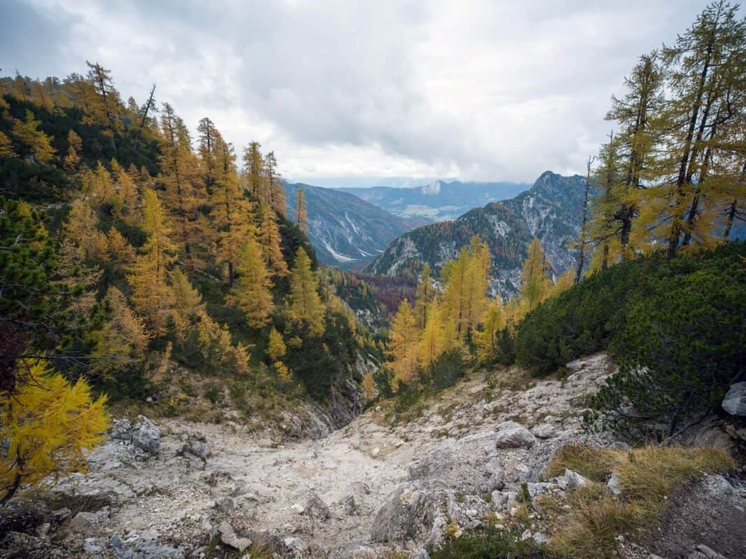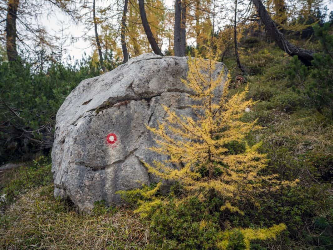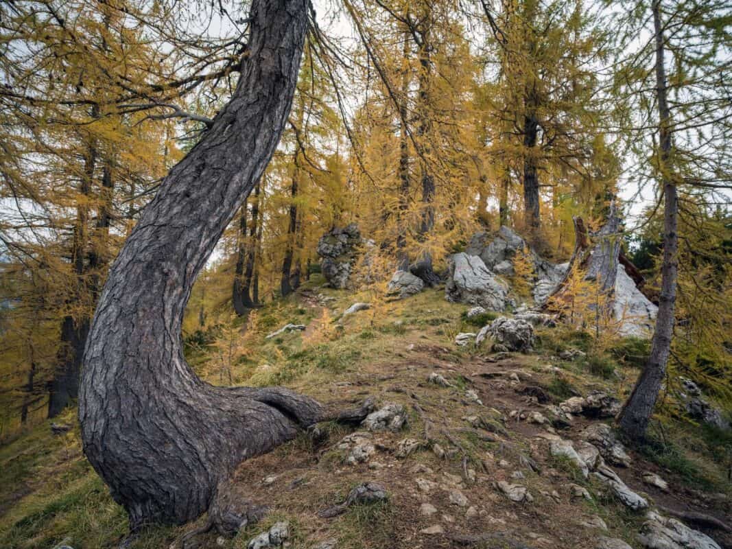 Als der Nachmittag zum Abend wird, beginnt die Sonne zu verblassen. Die goldenen Farbtöne der Lärchen färben sich orange, dann tiefrot, bis der ganze Wald wie in Flammen steht. Der Weg zurück nach Erjavčeva Koča fühlt sich zu dieser Stunde fast mystisch an. Die Stille wird tiefer, die Luft kühler und jeder Schritt wird langsamer. Es fühlt sich an, als wären Sie in eine andere Welt eingetreten – eine Welt, in der die Zeit langsamer vergeht und jeder Atemzug sich wie ein Geschenk anfühlt.